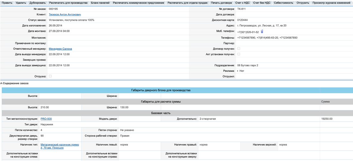 Форма заказа со всеми подробностями и кнопками (печатные формы, списание со склада, расчетами и т.д.)